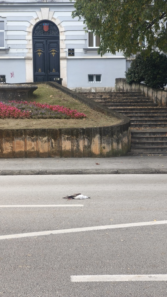 Uginuli galeb na sredini ceste ispred Palače pravde.