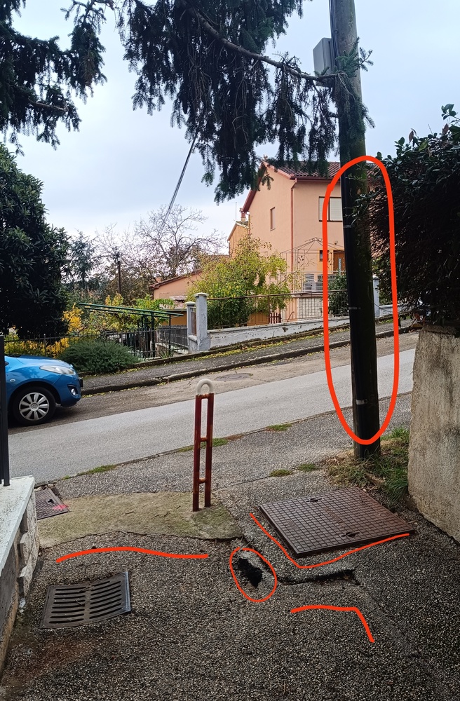 Pločnik se slijegao, a uz šaht se pojavila rupa iz koje izlaze pantigane. Šaht je napola vidljiv, a drveni stup je istrunuo i samo što nije pukao.