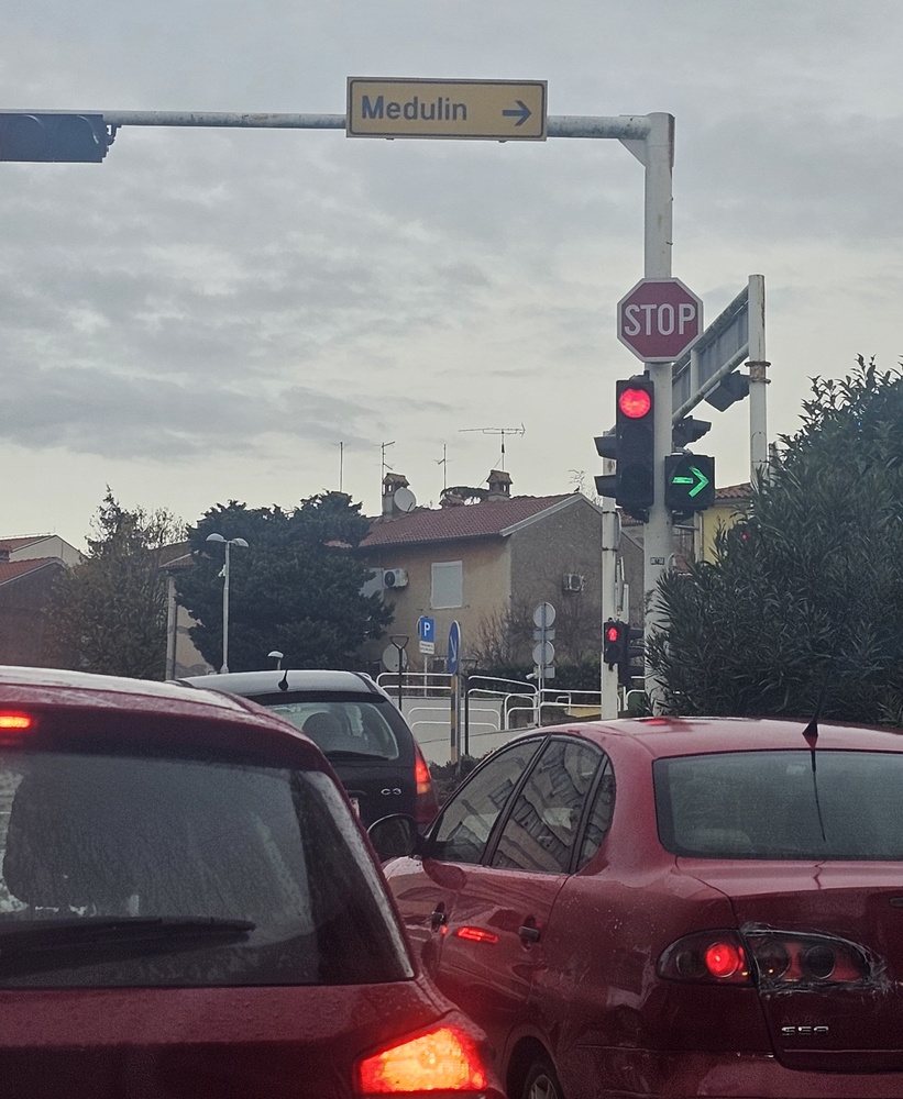 Prijedlog za uklanjanje dopunske strelice na semaforu na križanju Nazorove i Mutilske ulice. Naime, čim se strelica upali, 90% vozača skreće lijevo, dok rijetki skreću desno, što uzrokuje problem. Molim vas da razmotrite ovaj slučaj. Lijep pozdrav.
