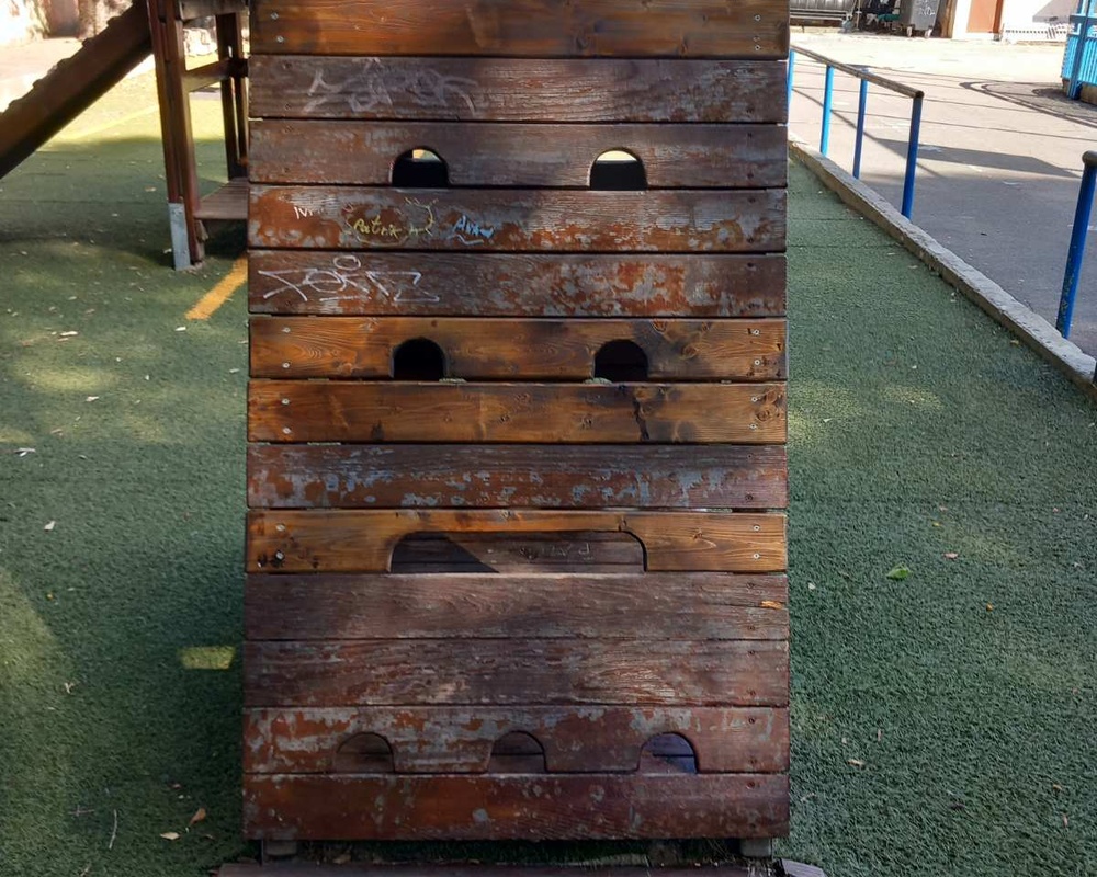 Na dječjoj spravi nedostaje daska. Vidljivi vijci su korodirani i predstavljaju opasnost za djecu. Potrebna je hitna intervencija, barem uklanjanje vijaka.