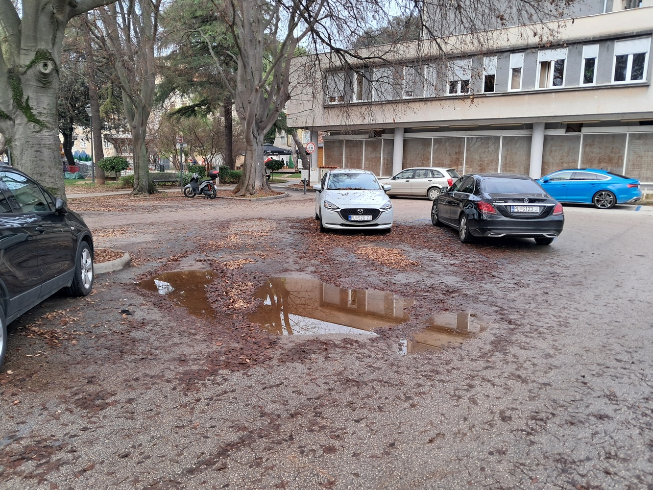 Stari grad Pula. Parking 5. zona. Benediktinska opatija. Ulegnuće i nakupljanje vode na označenom parkirnom mjestu.