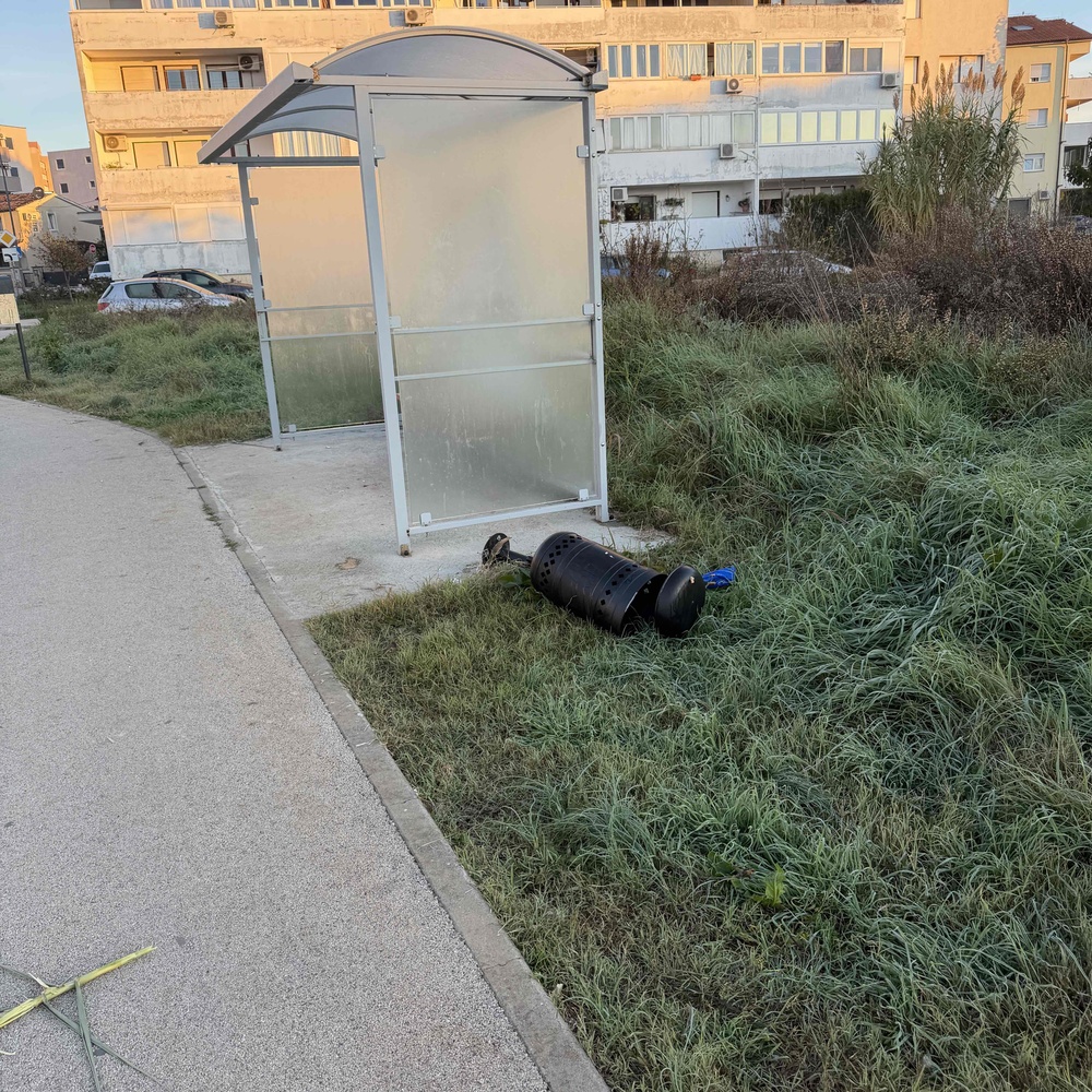 Kanta za smeće na autobusnom stajalištu je iščupana iz poda.