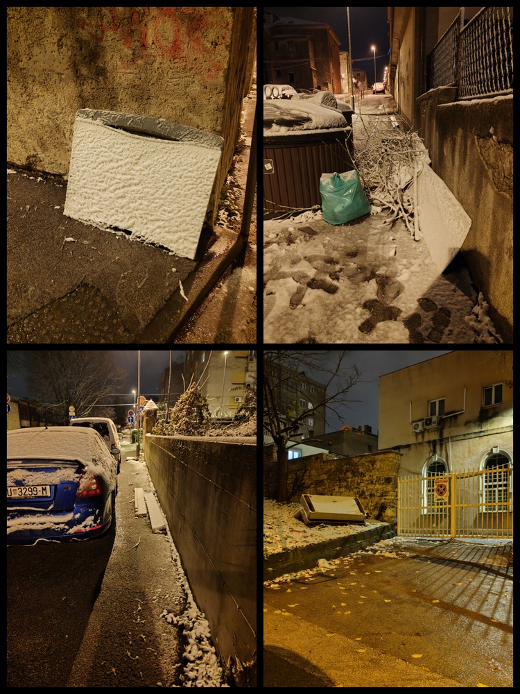 Poštovani, Na adresi Pula, Kovačićeva br. 1, na stražnjoj strani HEP-a, na zelenoj površini je već oko mjesec dana odbačen kauč. Na istoj ulici, pored automobila prema Rovinjskoj 5 i pored podzemnog kontejnera Rovinjska 5, dijelovi ormara stoje otprilike 3 mjeseca. Prijavljujem tek sada jer sam se nadala da će vaši djelatnici prilikom odvoza smeća i prolaskom tim ulicama vidjeti glomazni otpad i sami interno prijaviti da se to odveze. Hvala. Napomena: Aplikacija ne radi, stalno se blokira i ostaje u beskonačnoj petlji. Ako prijava bude poslana više puta, ispričavam se.