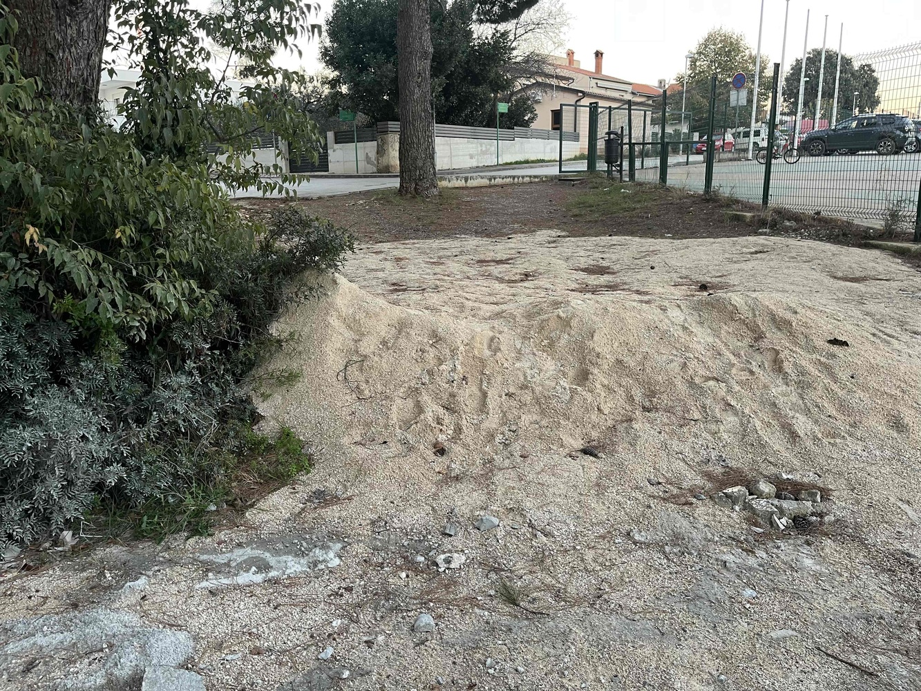 Na zelenom putu ostavljen je građevinski materijal nakon renovacije dvorane OŠ Veli Vrh. Radi se o pijesku i staklenoj vuni.