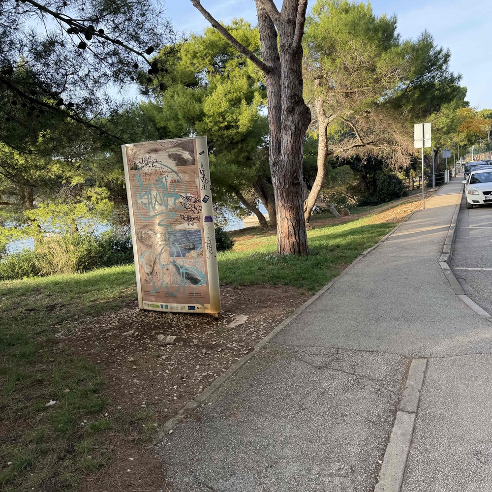 Lungomare. Informacijska tabla oštećena i prekrivena godinama... Sramotan i neuredan prizor.
