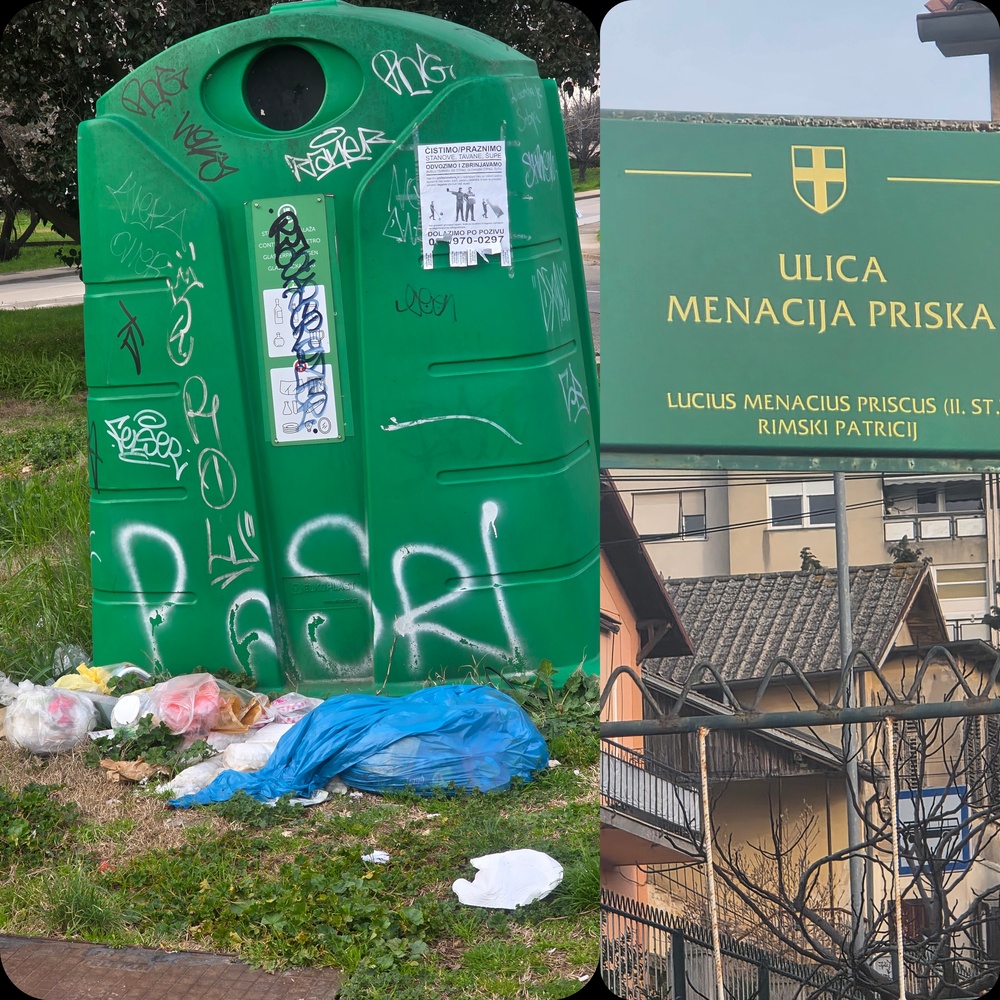 Na ovom raskrižju pored kontejnera za staklo svakodnevno se odlaže sav otpad, koji potom galebovi i druge životinje raznose po cijelom parkiću, stazi i cesti, te stvara užasan smrad.