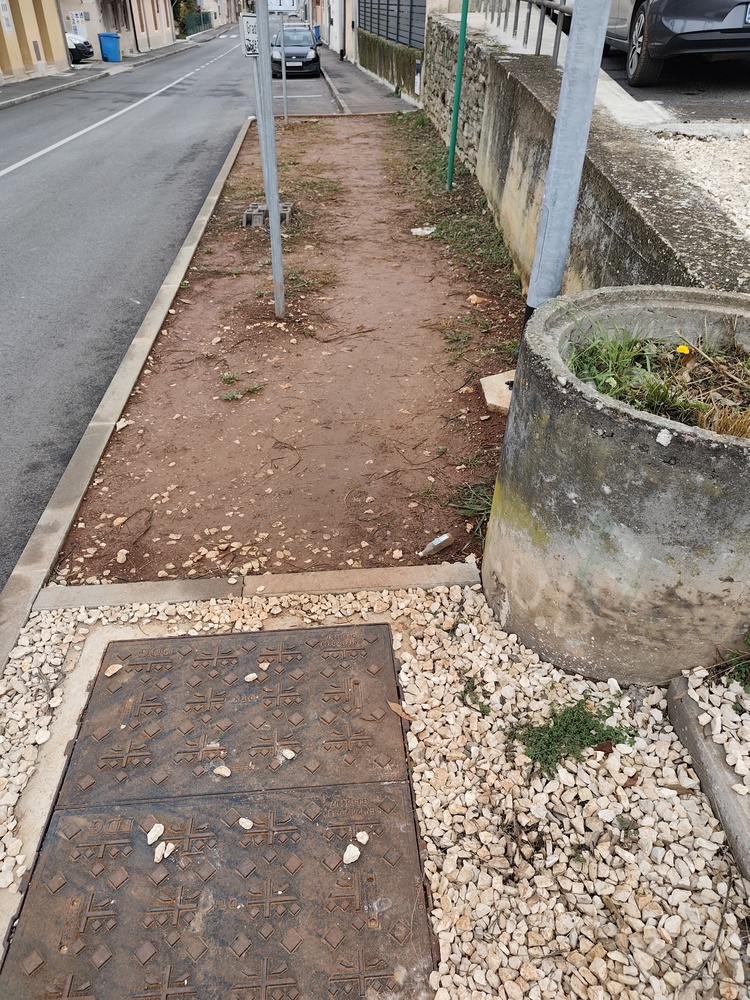 Poštovani, predmetna površina projektirana je i izvedena u sklopu nedavne rekonstrukcije Valturske ulice kao površina koja nije namijenjena za pješačku komunikaciju, već se pješačka komunikacija odvija isključivo putem asfaltiranih nogostupa. Srdačno, Grad Pula-Pola